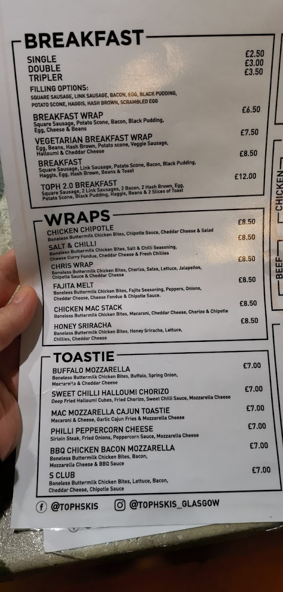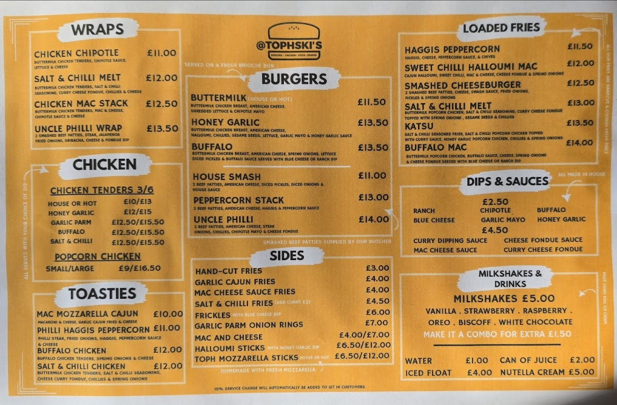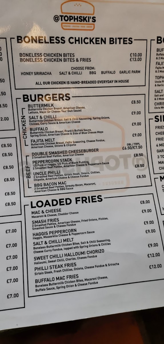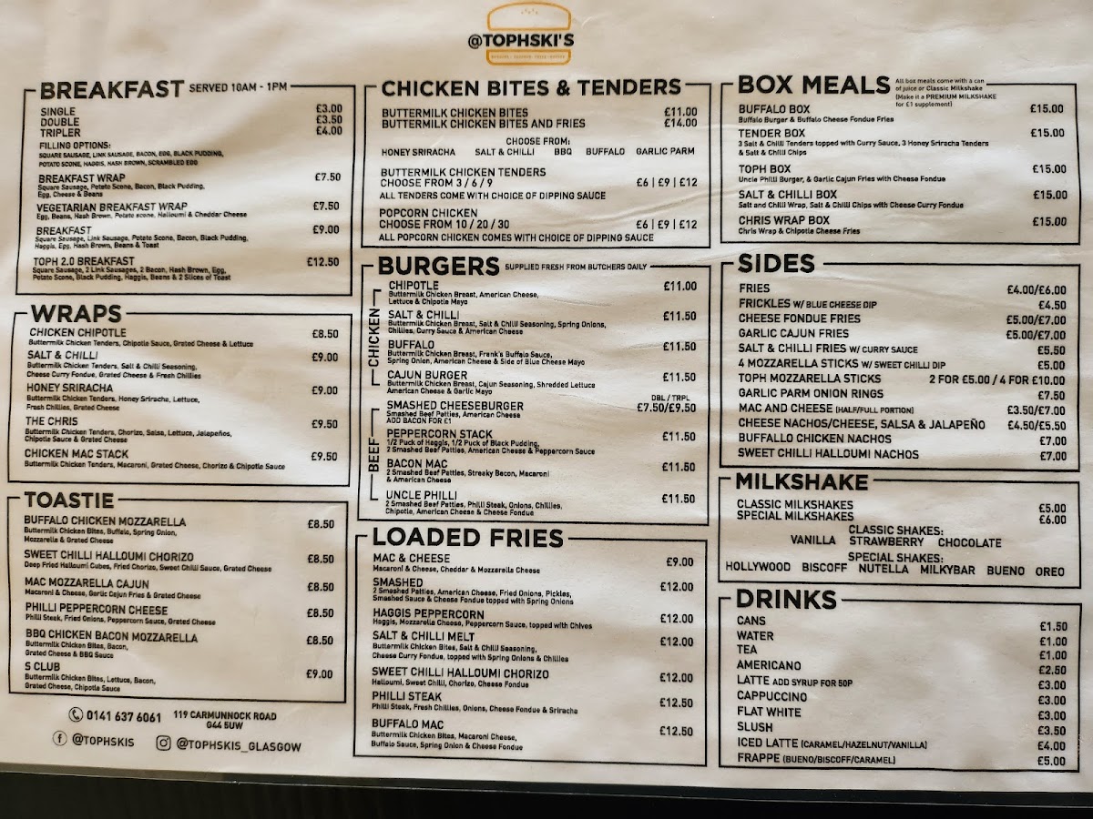Introducing the menu at @Tophski’s, a hidden gem located at 119 Carmunnock Rd, Glasgow. This eatery has quickly gained a reputation for serving delectable comfort food in generous portions. The menu is a delightful mix of flavors, featuring standout items like the Philli Steak chicken, Buttermilk Chicken Bites, and an array of mouthwatering burgers, including the Chipotle and Smashed Cheeseburger.
